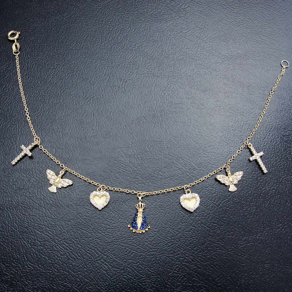 Pulseira AU 750 Cruz ,Pomba da Paz , Coração e Nossa Senhora Aparecida